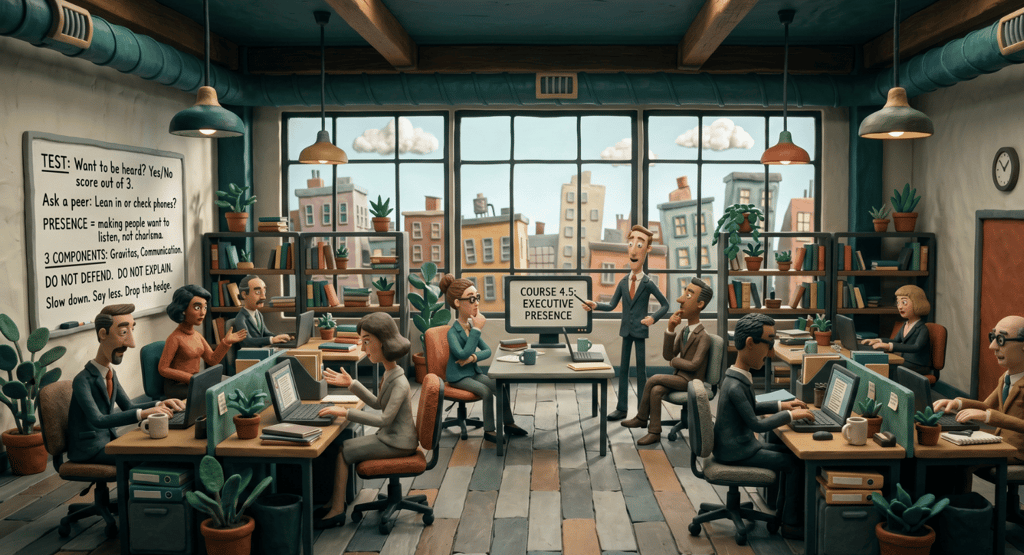 Executive presence is not about being impressive. It is about making people want to listen. Slow down. Say less. Drop the hedge. Recover once. Check your body before you enter. Prepare before the meeting. Hold ground without aggression. Handle interruptions. If presence backfires, read the room. If you cannot do all four, do the first one. Slow down. That alone will change how they see you.